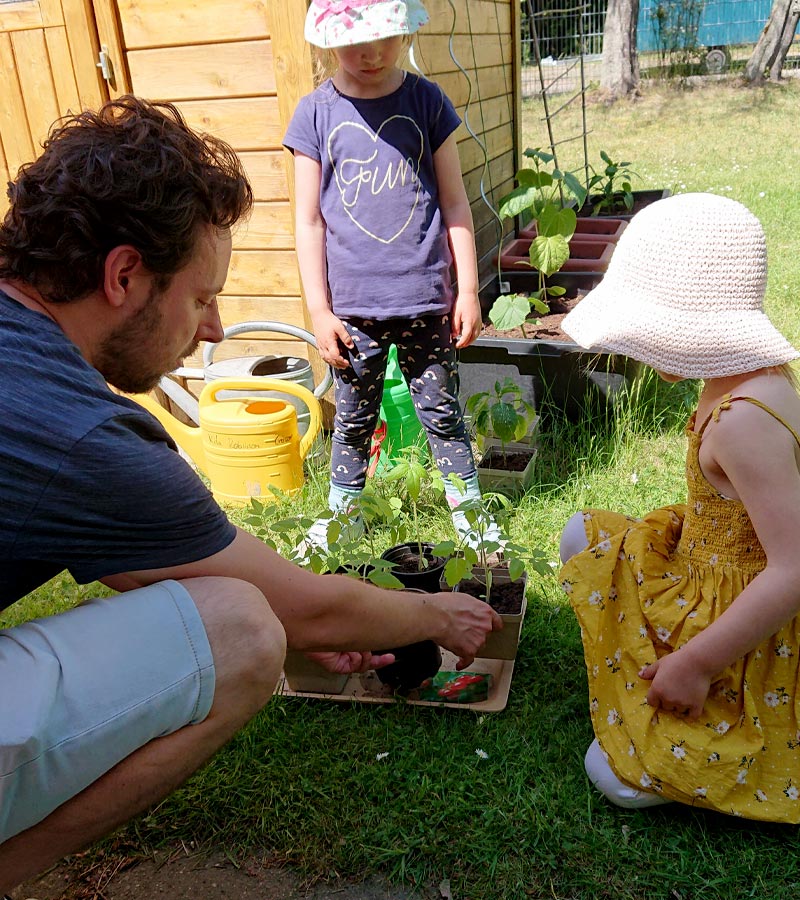 Heute sind unsere Tomatenpflanzen vom warmen und geschützten Fensterplatz in den Vorgarten gewandert. Hoffen wir, sie überstehen die Umstellung gut.