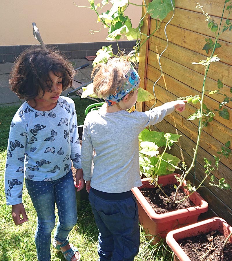 Heute haben wir im Vorgarten nach unseren Tomaten geschaut. Wie groß sie geworden sind und ob sie die 3 Wochen Ferien gut überstanden haben.