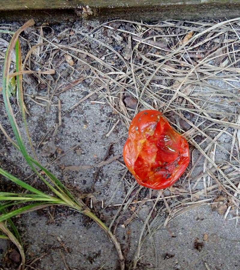 Anscheinend sind die Nacktschnecken an der Wand vom Gartenhäuschen hoch geklettert und haben die Tomate aufgegessen.