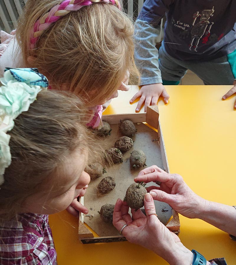 Wir haben heute nach unseren Kartoffeln geschaut, die nun seit ein paar Wochen im Keller am Fenster lagen, wo es kühl und trotzdem sonnig war.